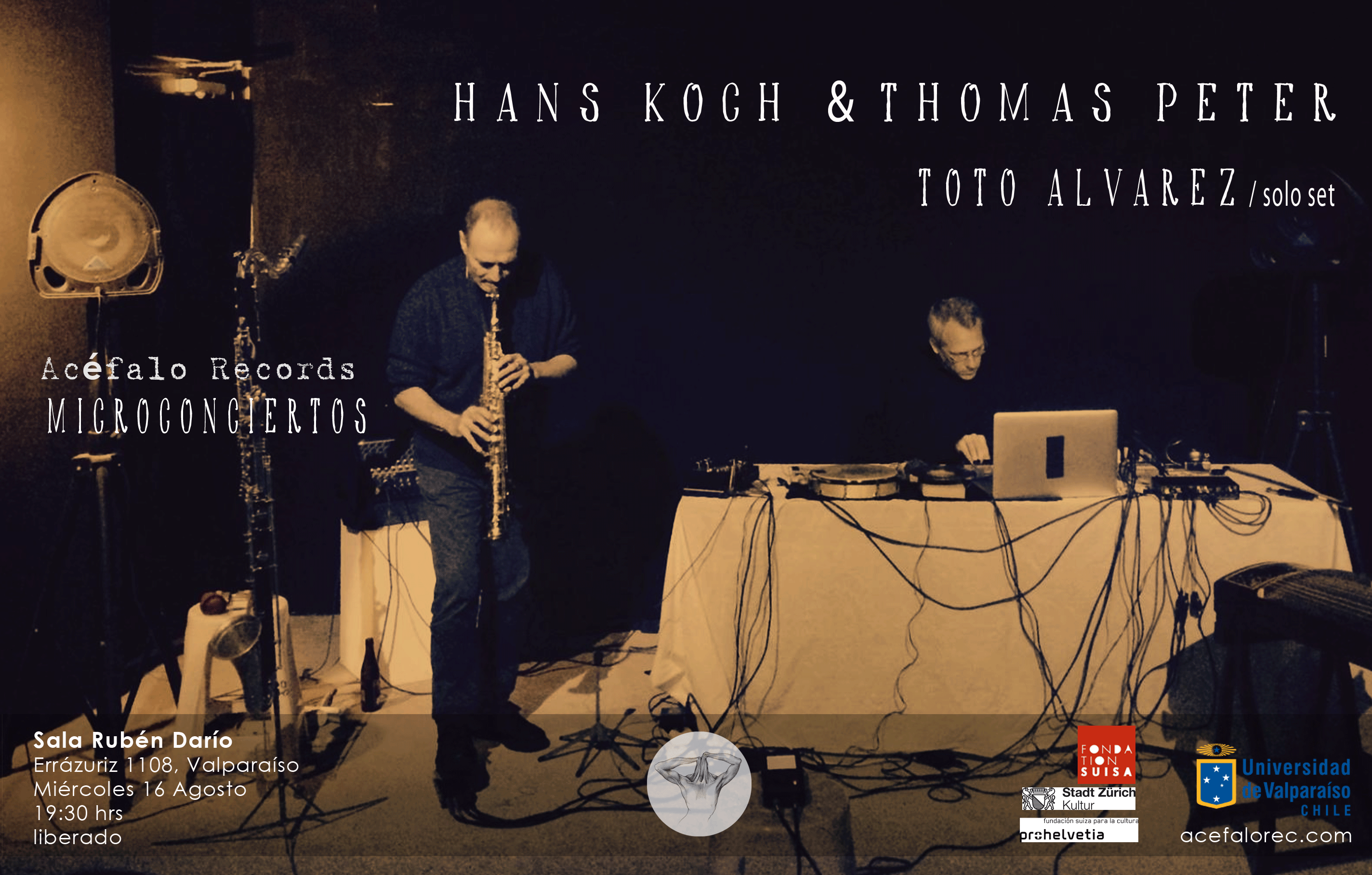 Microconciertos de Acéfalo Records presenta el dúo integrado por el experimentado músico europeo Hans Koch en saxos y clarinetes y Thomas Peter, objetos amplificados y live electronics , además del guitarrista Luis Toto Alvarez .