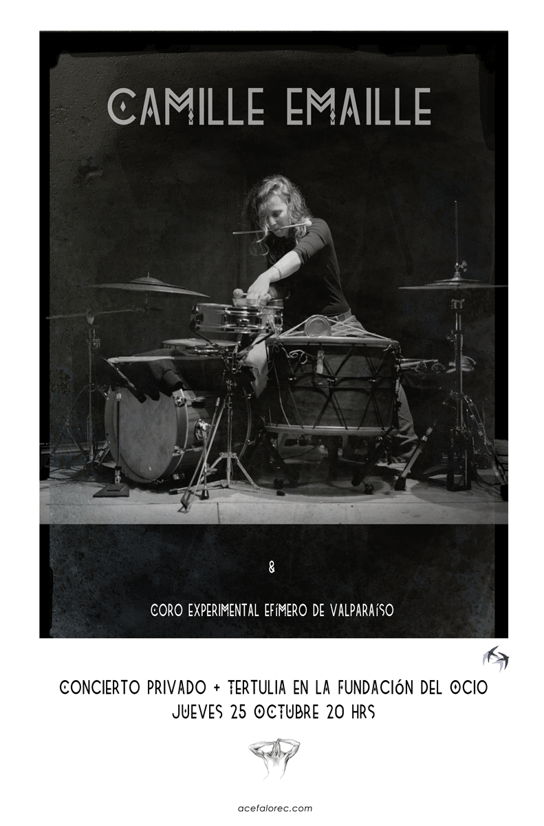 CAMILLE EMAILLE, Es una percusionista francesa nacida en 1993 en Niza. Estudió en la Musik-Akademie de Basilea (Suiza) con Christian Dierstein en música contemporánea y con Fred Frith en en materia de improvisación libre, ahí obtuvo su licenciatura en percusión con excelencia. En el año 2016 fue becaria invitada en Mills College y estudió allí con William Winant y Roscoe Mitchell y en el 2017 lanzó su primer álbum en solitario por el sello portugués Creatives Sources Recordings. Actualmente trabaja en múltiples proyectos, como los montajes de Teatro Musical del gran compositor alemán Heiner Goebbels.